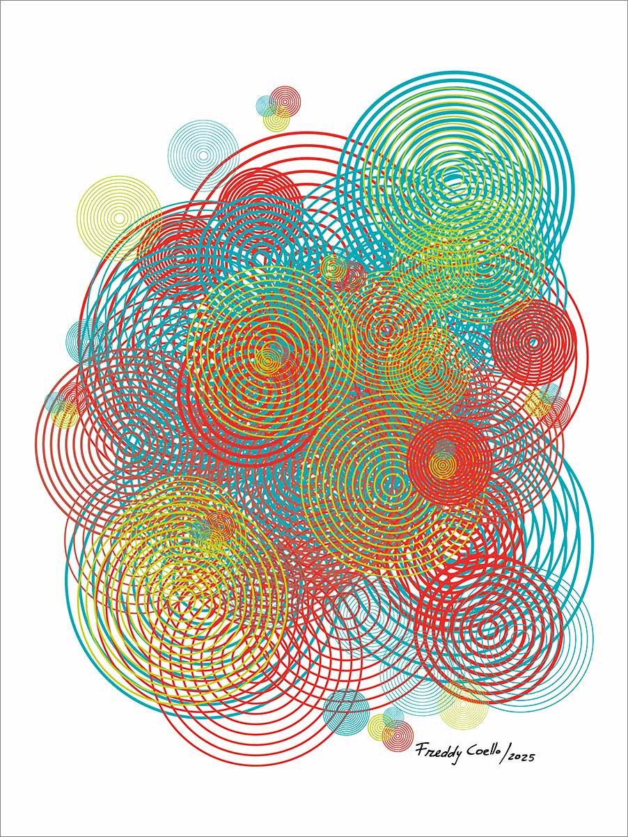 Freddy Coello (Quito, 1968) habita el arte como un territorio de exploración incesante, donde cada obra se convierte en un diálogo entre la materia y la memoria. Su trabajo no se limita a la representación: es un campo de tensiones y encuentros, donde el color, la textura y la forma se entrelazan para construir un lenguaje propio, sensible y profundamente humano.